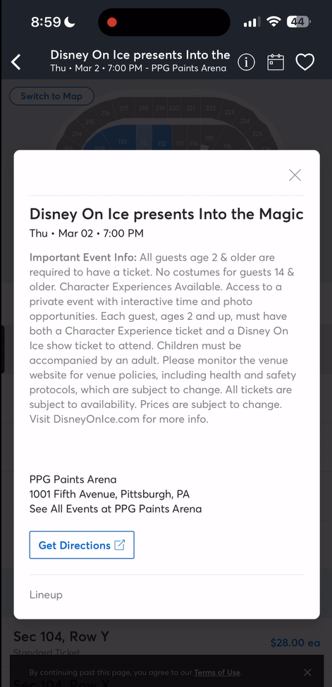 Les règles et les prix des billets pour enfants varient selon les événements. Sélectionnez le bouton Plus d'informations sur la page de détails de votre événement sur les sites Web pour ordinateur de bureau et mobile ou l'icône i sur l'application pour consulter les politiques, le cas échéant. Si aucune information ne s'y trouve, vous pouvez les trouver en cliquant sur le lien vers la salle.